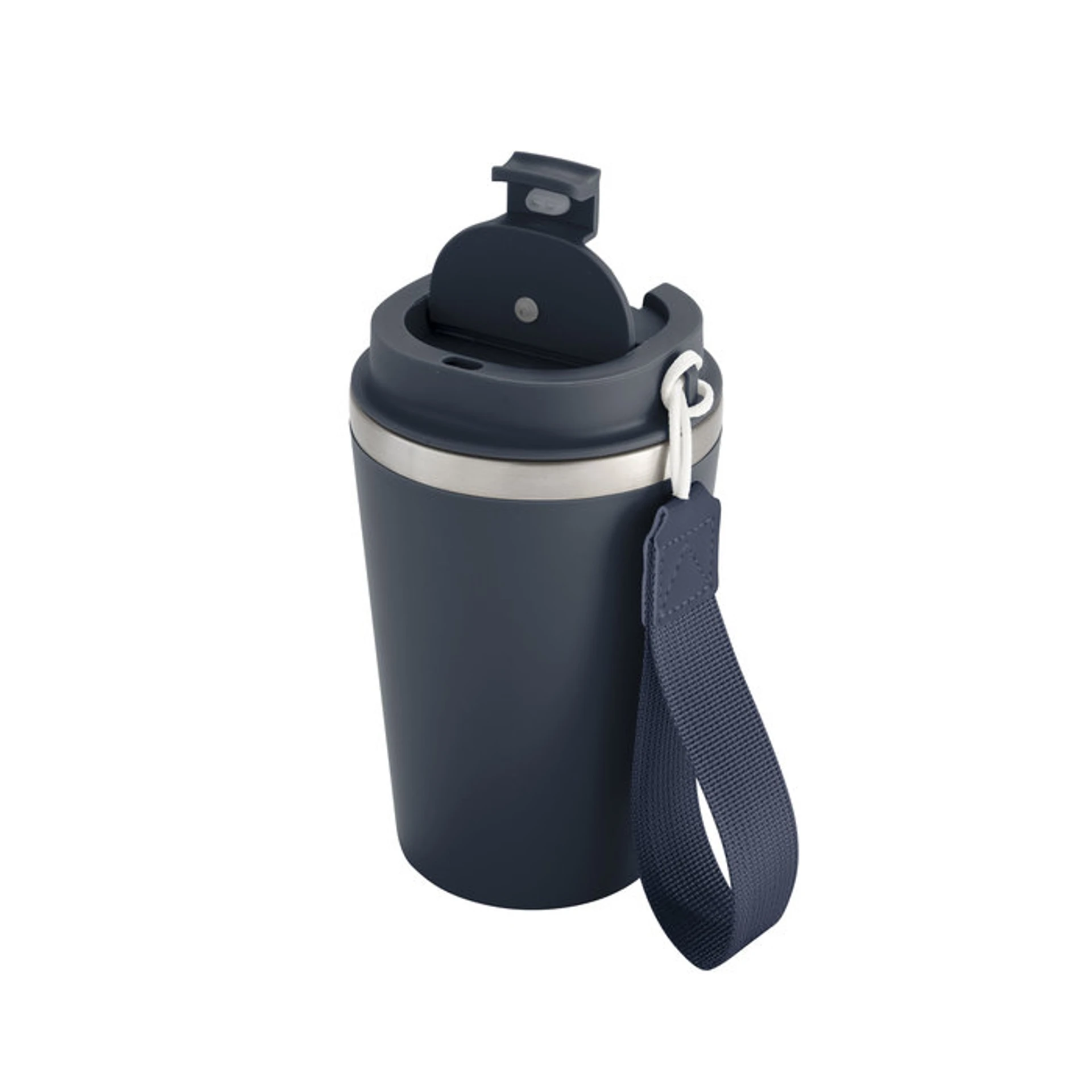 Mug doble pared con asa colgante. Interior de acero inoxidable 304 y exterior de Polipropileno con acabado mate. Tapa a rosca de polipropileno con anillo de silicona y seguro antiderrame del mismo color del mug. Asa de poliuretano y poliéster. Medidas: Ø 8,9 cm x 15 cm. Capacidad: 350 ml. Materiales: Acero inoxidable, polipropileno, silicona, poliuretano y poliéster. Presentación: en caja de regalo Kraft.