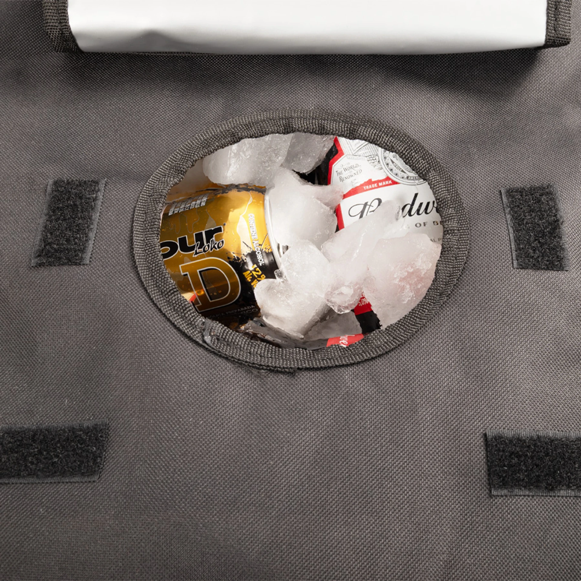 Bolso cooler grande de 50 litros de capacidad, en tela poliéster 600D/PVC. Interior térmico aislante de PEVA y acolchado con esponja PE FOAM. Cuenta con asas laterales para sujeción, cierre eclair 360°, ventana cuadrada con cierre velcro en la parte superior (tapa), para retiro ágil de productos y tapón de goma inferior para despiche de líquido acumulado dentro del cooler. Montado sobre estructura de patas metálicas plegables color negro, presentadas en bolsa de poliéster negro. •Tamaño: Bolso cooler: 48 x 30 x 35 cm. / Montado con patas: 48 x 39 x H 85 cm. •Peso: 3 kg •Capacidad: 50 L •Material: Poliéster 600D/PVC, PEVA aislante, esponja PE FOAM