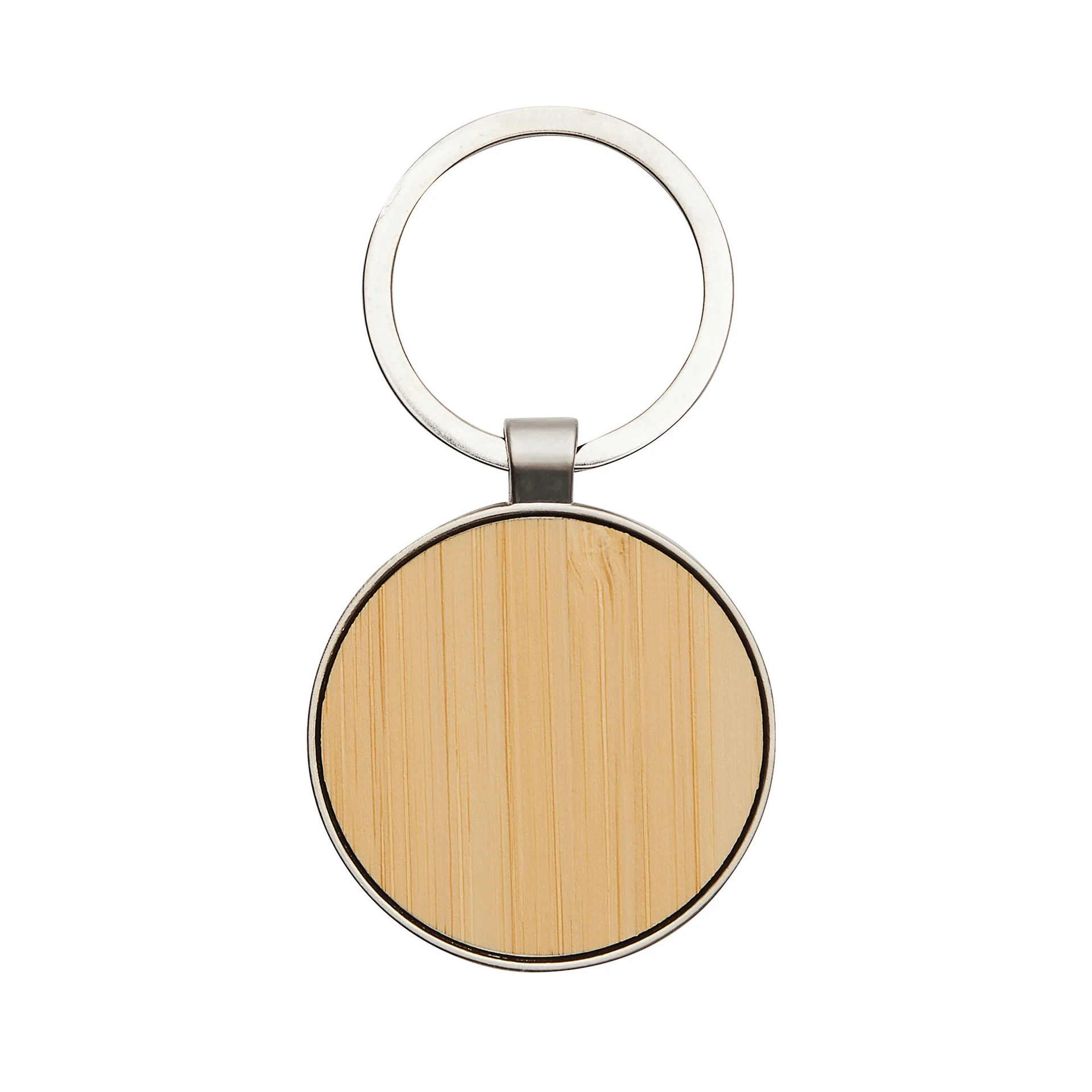 Lleva un toque rústico y clásico en tu bolsillo. Llavero con forma circular. Estructura metálica con aleación de zinc con acabado brillante y panel frontal de bambú barnizado. Medidas: 7,5 x 4 x 0,7 cm. Materiales: Hierro y Bambú. Presentación: en caja de regalo kraft con bandeja de terciopelo color negro.