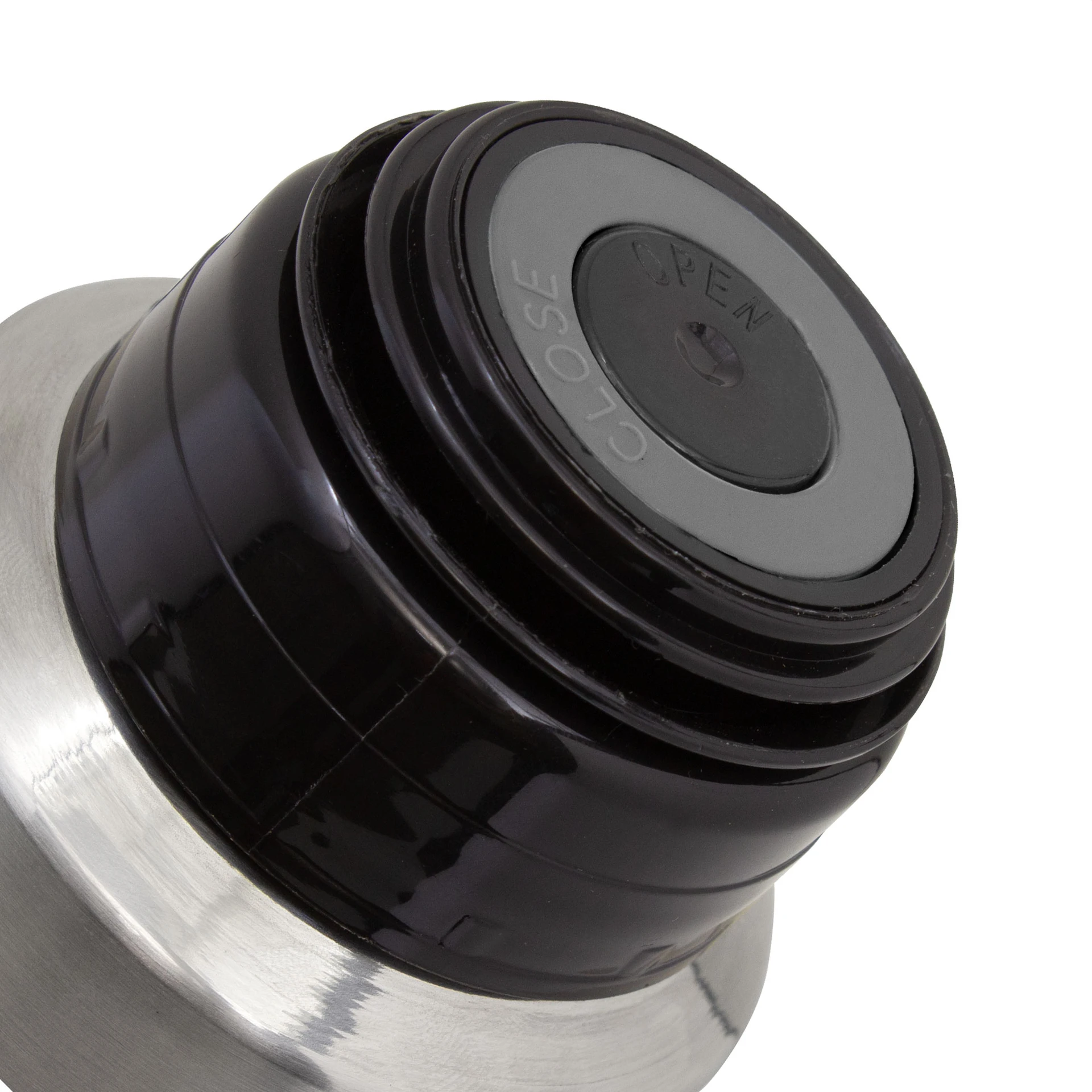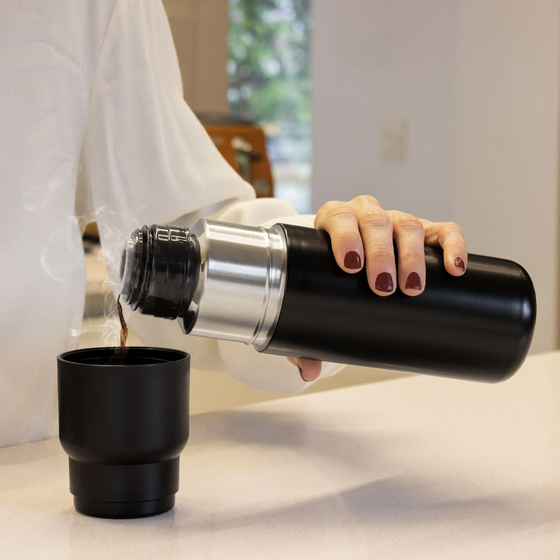 Fusiona el diseño compacto multiuso y el rendimiento prolongado. Termo con taza. Termo Doble pared sellado al vacío. Interior en acero 304 y exterior en acero 201. Tapa y taza plásticas a rosca color negro. Tapón con apertura y cierre a presión. Mantiene por más de 12 hs la temperatura de las bebidas calientes y 24 hs de las bebidas frías. Medidas: Ø 7,2 x 24 cm Capacidad: 500 ml. Materiales: Acero inoxidable y Polipropileno. Presentación: en caja de regalo kraft.