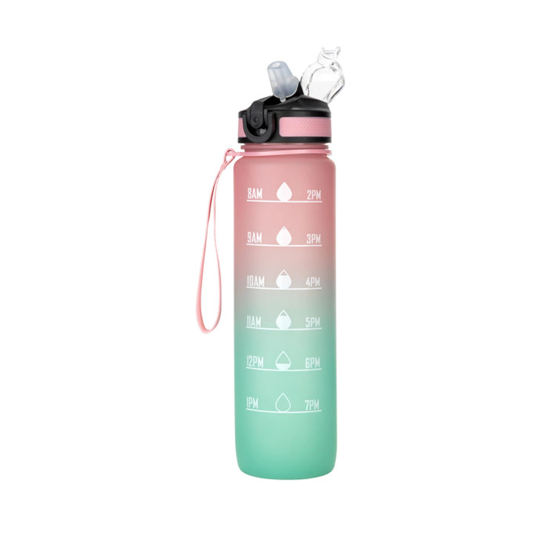 Botella con marcador de tiempo y medida. Colores pastel bitono en degradé con acabado frost. Tapa plástica combinada en color negro con un color de la botella. Apertura rápida, boquilla transparente rebatible y sorbete incluído. Correa del mismo color de la botella. Medidas: Ø 7 x 28cm. (con tapa) Capacidad: 1000 ml. Material: Plástico PETG, polipropileno, poliestireno y silicona. Presentación: en caja de regalo kraft