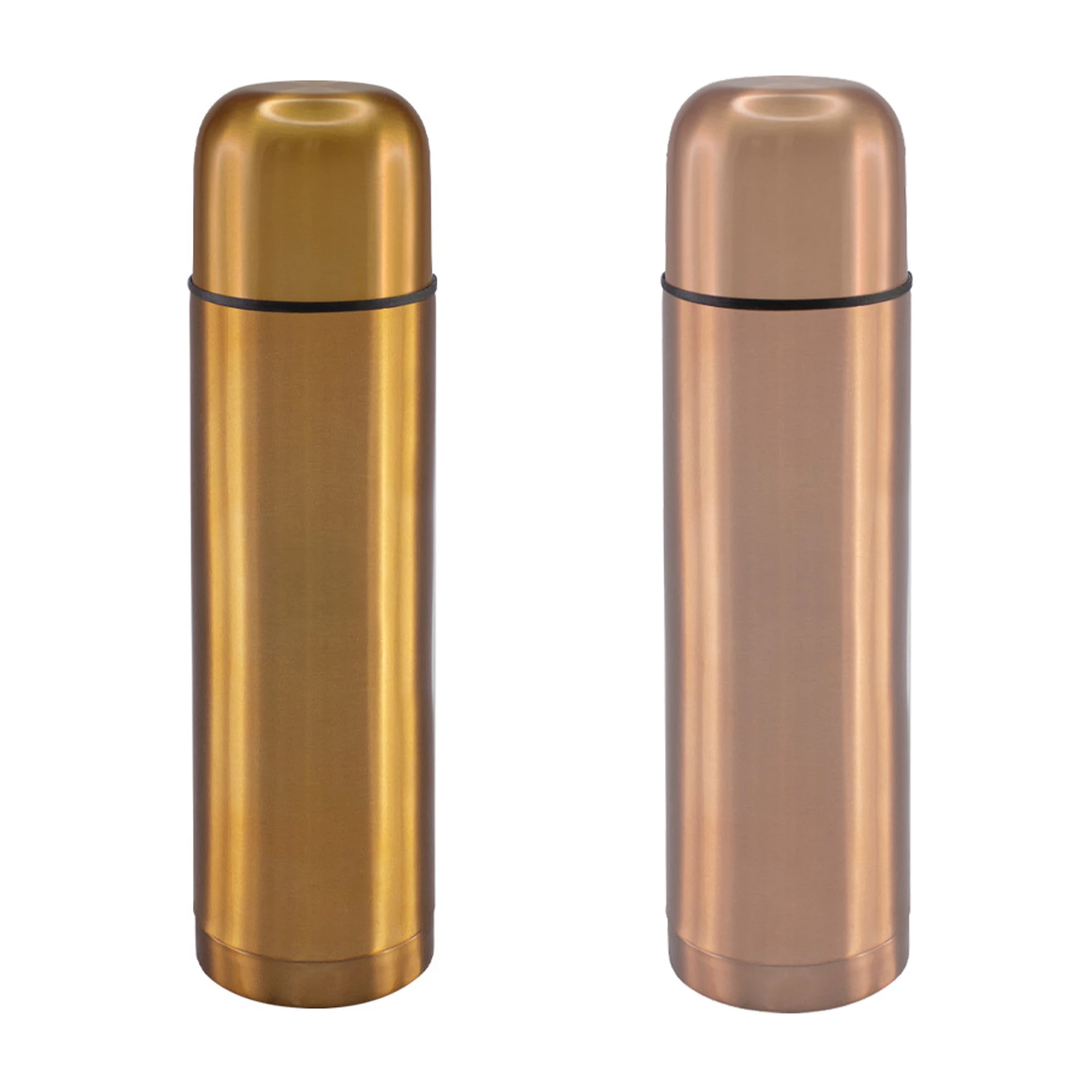 Termo metálico de 1/2 litro con un elegante acabado encobrizado, ideal para mantener tus bebidas a la temperatura perfecta. Su práctico dosificador en la tapa facilita el vertido. Viene presentado en un estuche de cartón laminado negro, perfecto para regalo o para un almacenamiento cuidado. Con un tamaño de aproximadamente 7 x 24 cm, es fácil de transportar. Disponible en colores dorado y cobre. Personalízalo con serigrafía o grabado láser para un toque único. Una opción sofisticada y funcional para el día a día.