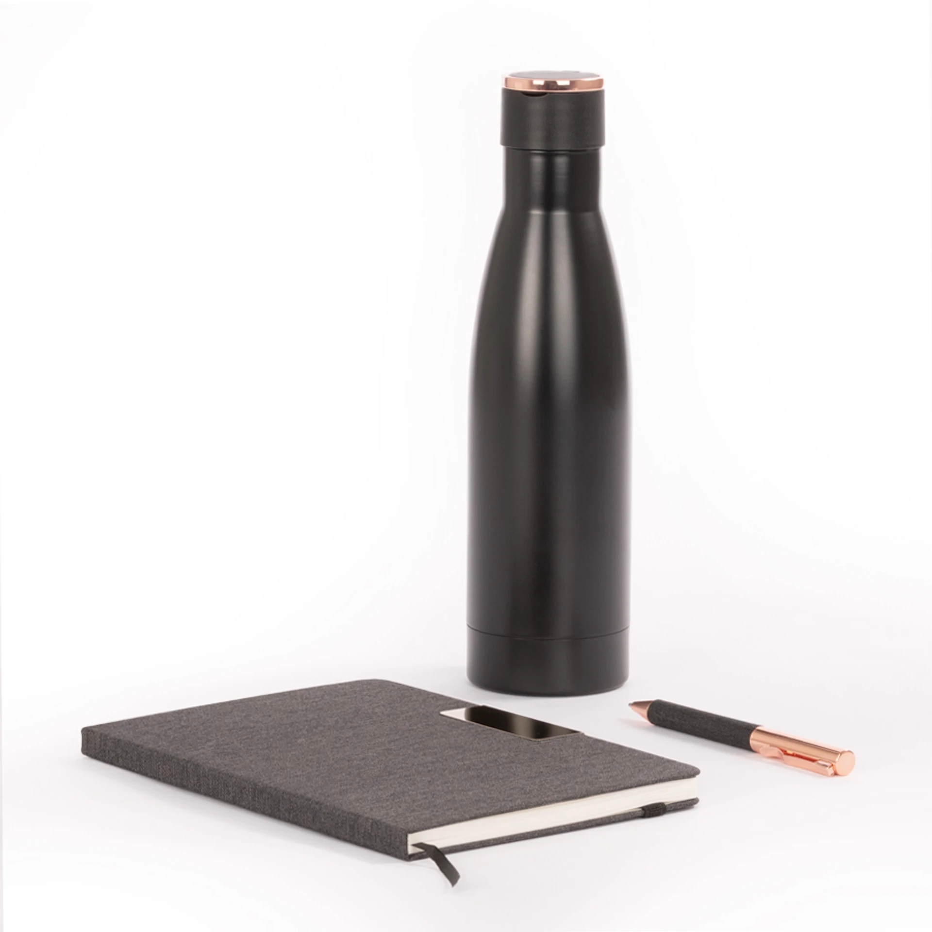 Set de Regalo incluye Termo 550 cc. producto BPA FREE, para el contacto con líquidos y alimentos, con tapa twist-off y asa redonda encobrizada + Cuaderno tapa dura recubierta en tela Oxford negro, con cierre elasticado y detalle metálico encobrizado, interior 80 hojas punteadas (dotted) color ivory (hueso) + Bolígrafo metálico encobrizado con tela Oxford negra, escritura negra . Presentación en elegante caja de carton color negro con tapa, interior cuna de EVA aterciopelada negra. Sobre funda de papel negro. •Tamaño: Caja: 27.7 x 30 x 8 cm. / Termo: Ø6.9 x 26 cm. / Cuaderno: 14.6 x 21 x 1.2 cm. / Bolígrafo: Ø1.1 x 13 cm. •Capacidad: Termo: 550 cc. •Presentación: Elegante caja de carton color negro con tapa, interior cuna de EVA aterciopelada negra. Sobre funda de papel negro. •Material: Acero Inoxidable, Tela Oxford, papel, EVA, cartón.