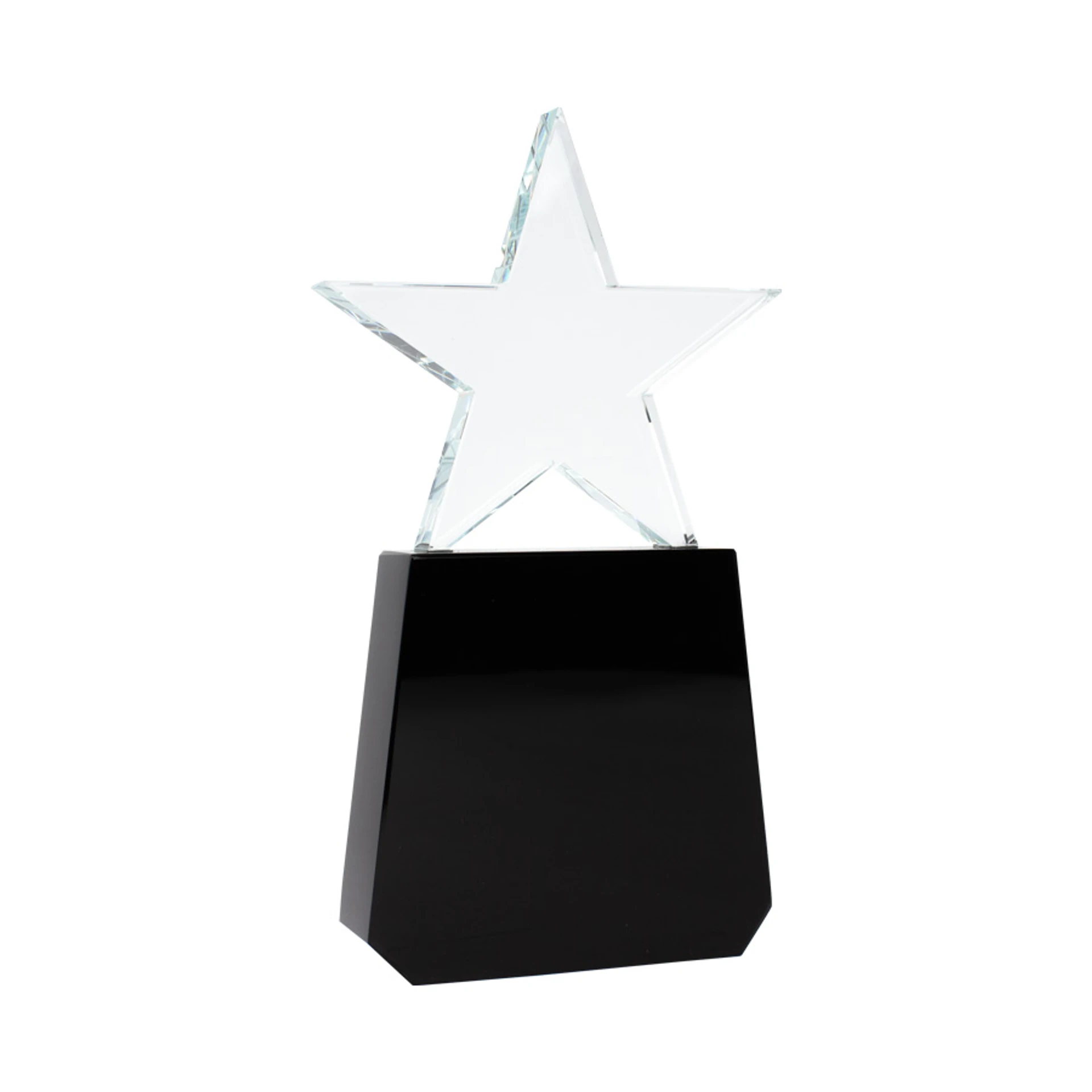 Elegante Trofeo modelo «Biondi», base de cristal negro y estrella de cristal en su parte superior. Presentación en caja de cartón forrado negro con cierre imantado, interior acolchado de espuma y tela poliéster satinado negro, con troquel.